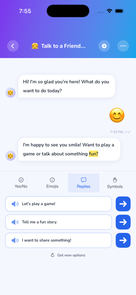 An AI-powered communication app that helps non-verbal teens and young adults have real conversations — with fun topics, text-to-speech, and reply suggestions they can send with a single tap.